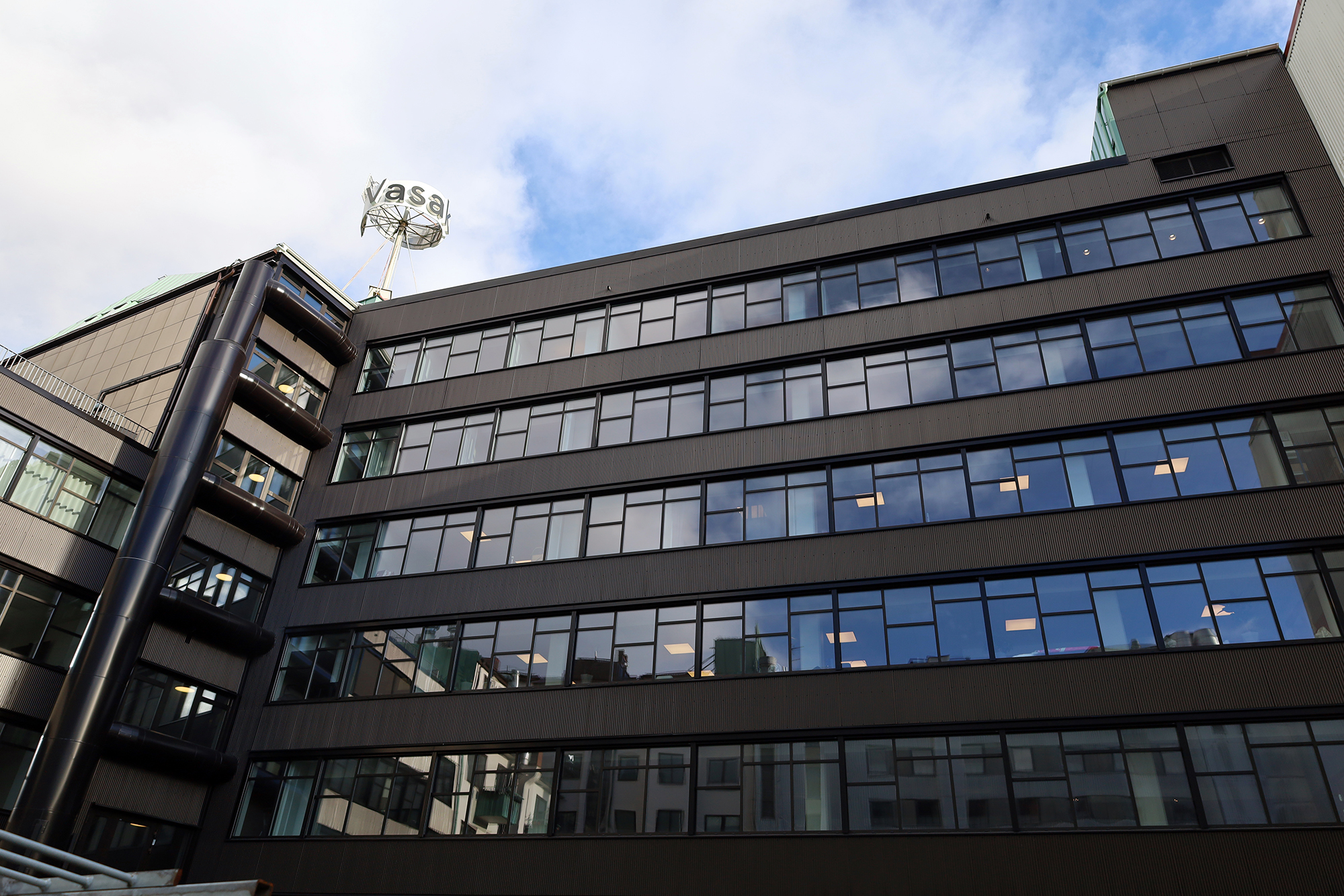 Huset består av åtta våningar över mark med fasad både mot Södra vägen, Storgatan och en innergård. Vestia har demonterat all installation på ytterväggarna, värme, ventilation och el. Vi har rivit hela ytterväggen och byggt upp ny vägg för att sedan återmontera värme, ventilation och el på nytt. Fasadarbetet omfattar 2100 kvm och har skett med pågående verksamhet i kontorslokalerna.
